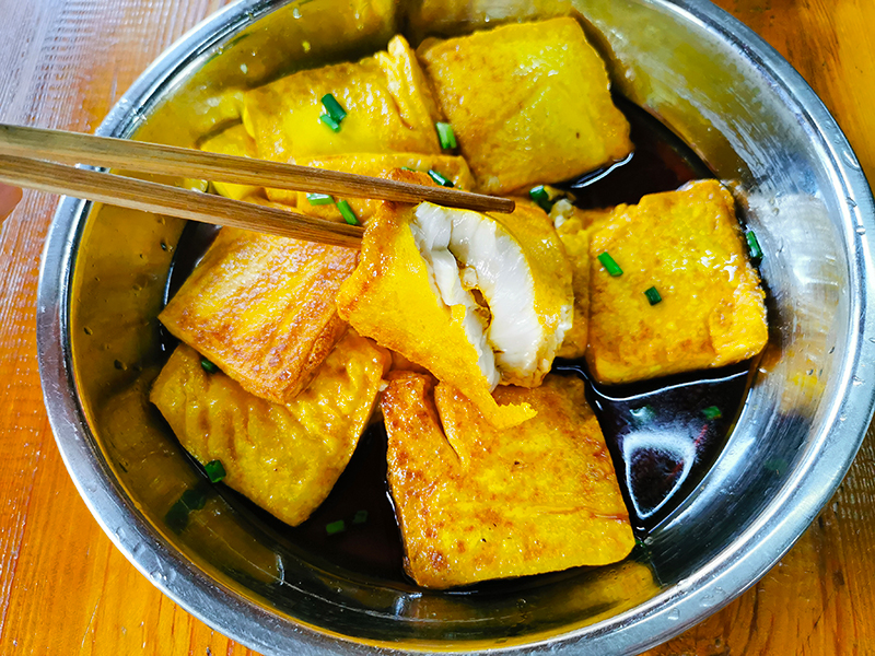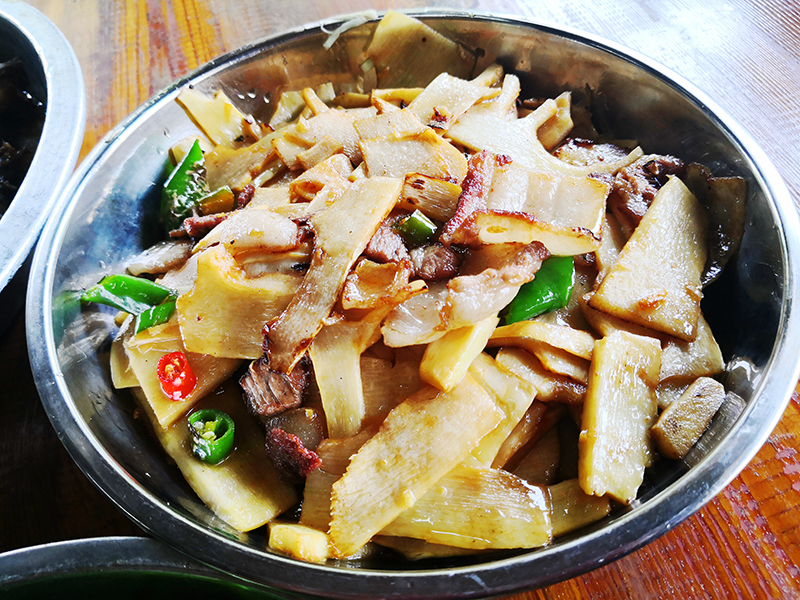 乡野的朴实,还体验在菜肴上。 上桌的菜肴,分量杠杠而味道绝佳,最难能可贵的当数那种“乡土味”。 最出乎意料的蒸鱼,虽然只是简单地放上盐水清蒸,甚至连姜葱香菜都没多放,却丝毫不觉腥味。鱼肉在山泉水和盐巴的浸润提味下,充分发挥了原有的食材鲜美。而在柴火灶上的火候加工,则让鱼肉分外滑嫩。
