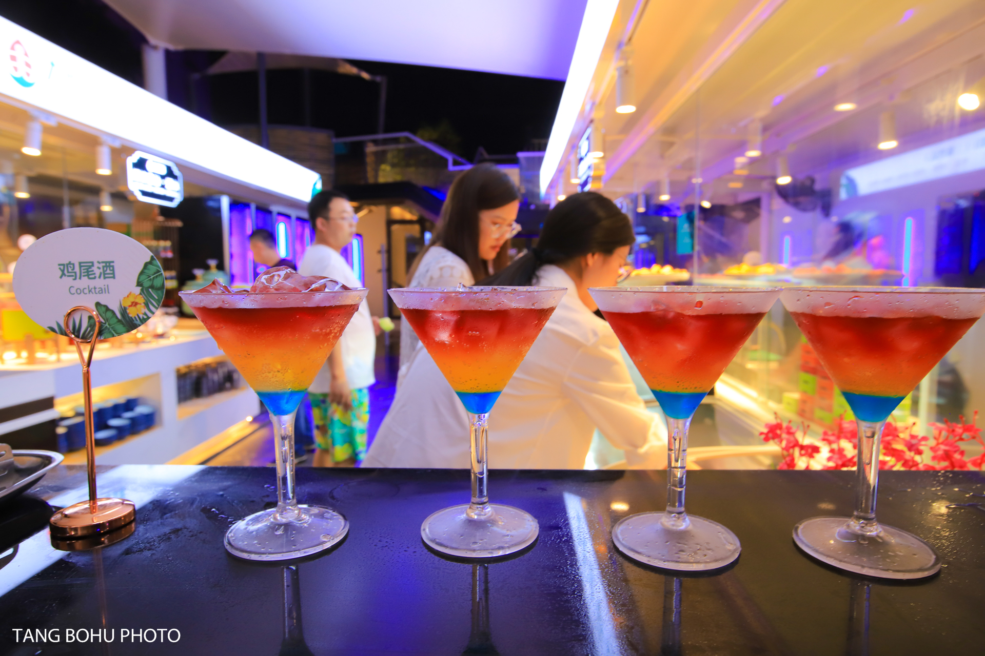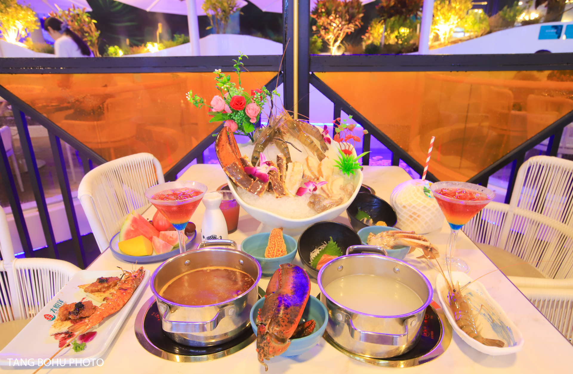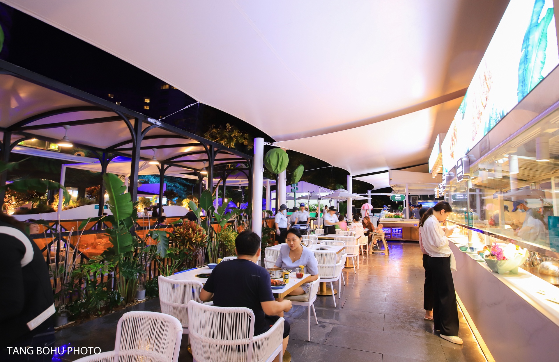 这里十分适合拍照,餐厅以蓝白色为主色调,蓝白相间的颜色让人感到清爽干净,自助餐是在户外用餐,周边椰子树围绕着整个餐厅。晚上灯亮起的时候很美,紫色的灯光不失浪漫。入口旁还有透明空调屋,有喷泉流水池,还有可以俯瞰所有美食的二楼树屋,伴着潺潺流水用餐惬意又浪漫。