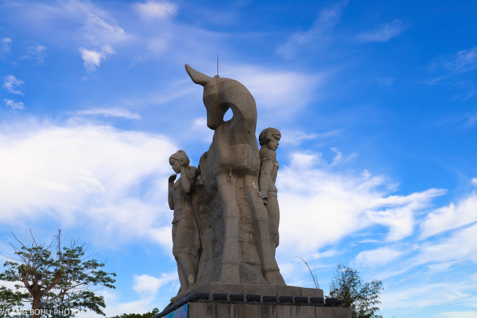 走到山顶就来到了著名的鹿回头雕像,这是关于鹿和一对黎族年轻人的爱情故事。只见雕像上一面是黎族的男生一面是黎族的女生,鹿在中间站着。