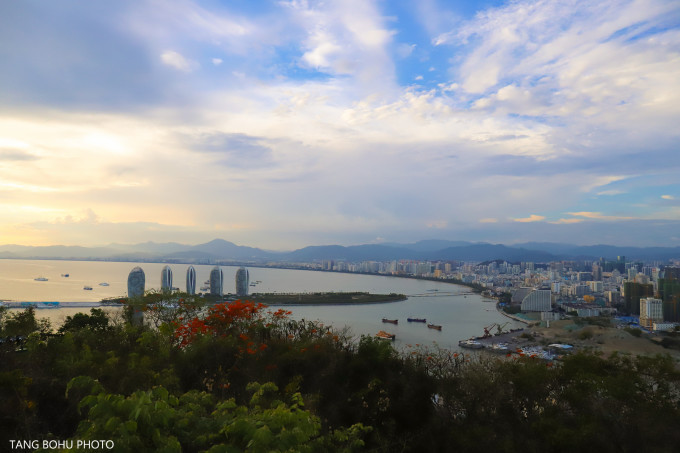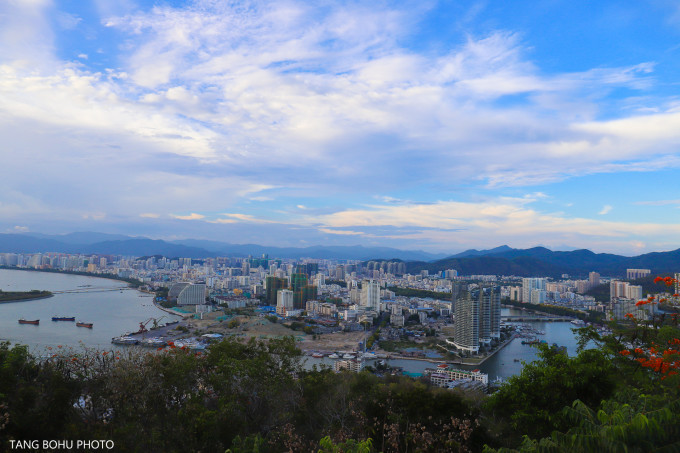 走到半路上看到 三亚 游艇码头的另一边,渔船,小渔村与对面的高楼形成了鲜明的对比,一半是城市,一半是农村的感受吧。蓝天下,从山顶看到 三亚 的景色又像是一幅画一般,有山有海有船。一条公路沿直伸到山上,山上的凤凰花开了,慢慢地从树中的缝隙里看到 三亚 的另一面。随着继续往山上走,景色也越来越漂亮了, 三亚 的全景慢慢地浮现在眼前。