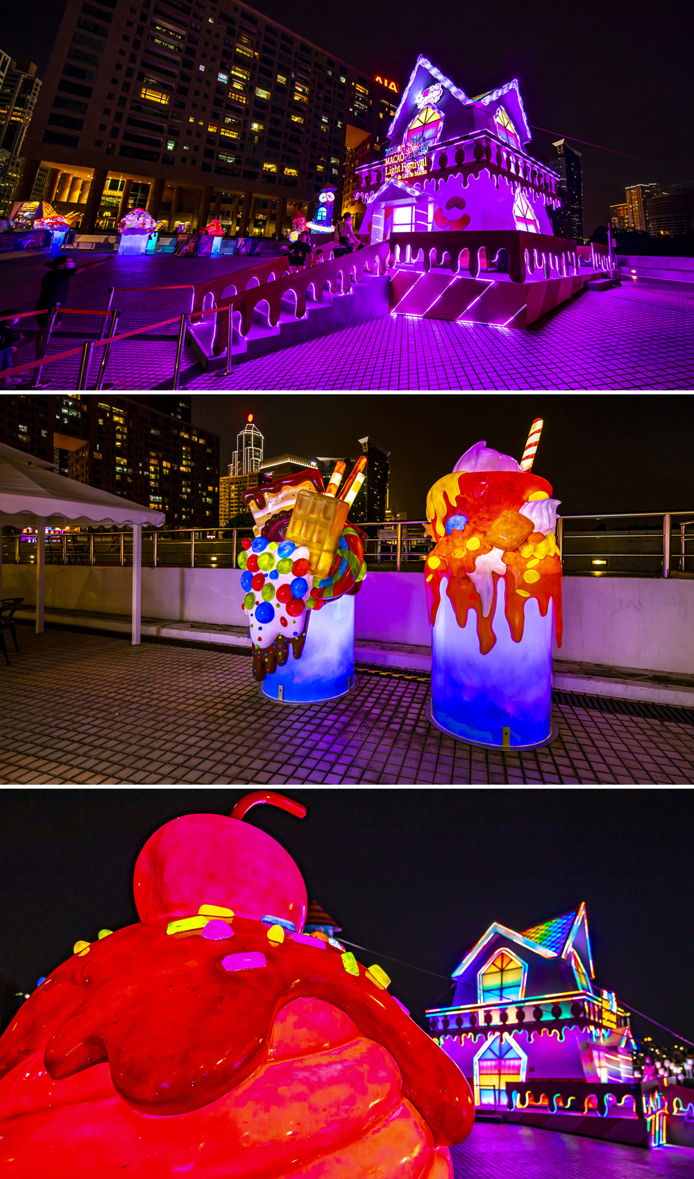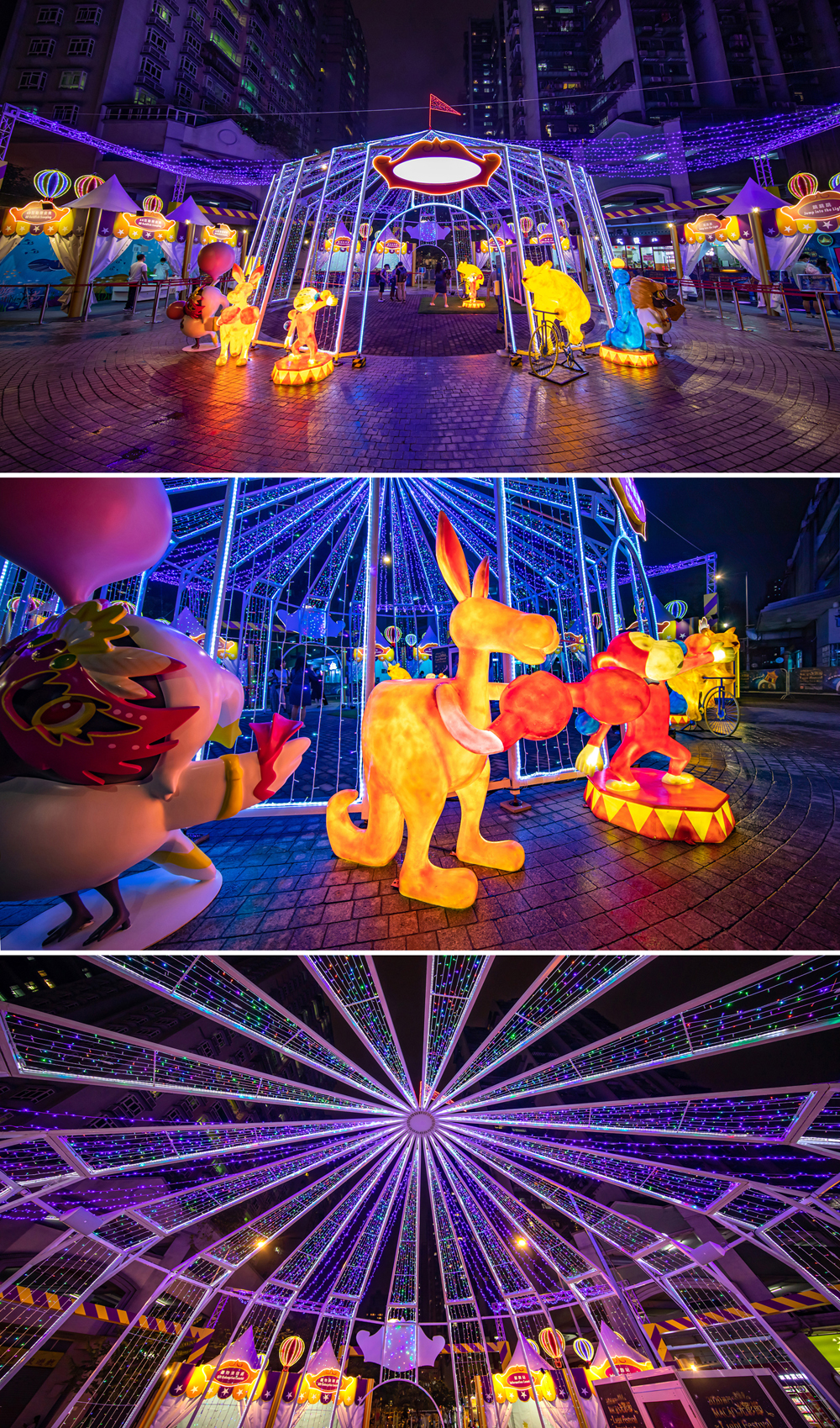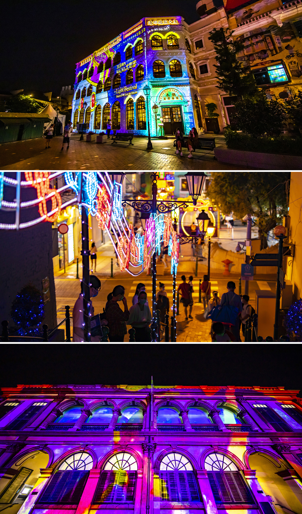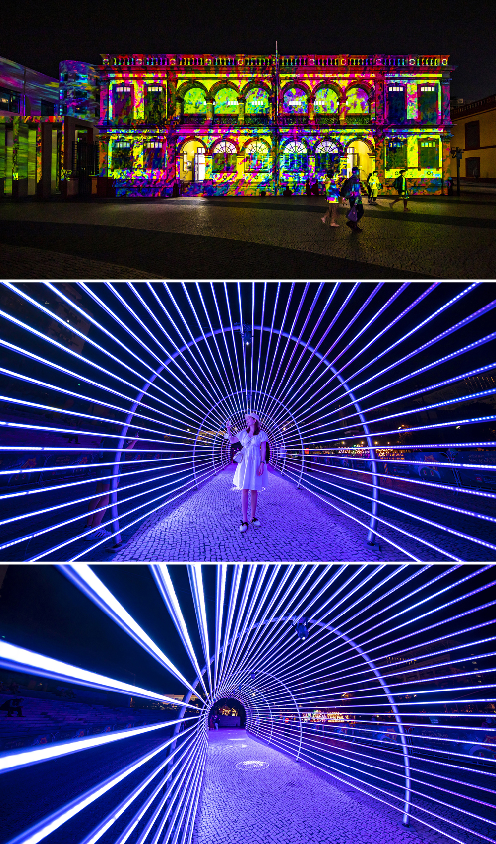 一座光的教堂矗立在官也街的广场上,葡式传统的花纹,蓝白色耀眼的光,融汇在绿意和官也街的老建筑间,教堂的里边是一个大大的水晶球,小朋友转动硕大的发条钥匙,彩虹马在水晶球里转动起来,音乐也在四下悠扬演奏,小朋友的眼神充满了好奇,我们就像落在了小人国里,身边的一切都是那么梦幻。
