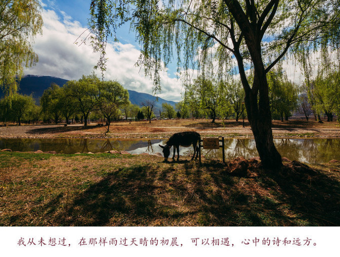 那天我望着你上车离开,心中突然有些伤感,好像还有很多话没说完,很多风景还没看完,只是才见面不久,却又分别了。我想,你应该还留恋着在云南的日子吧,从大理到泸沽湖,你期待了好久,终于一路走了过来。我又何尝不是呢?当我坐在回程的飞机上,突然有想哭的冲动,对于离别,我可能有太多不舍了。这一路的旅程,就好像一场梦一样,或许应该说,比梦还要美。 在某个寂静的深夜里,我伏案桌前,又想起大理的天,阳光穿过云层洒在碧绿的麦田里,清澈而温暖;想起洱海的风,轻拂过你的发稍,在海边的树旁,留下你迎风而立的背影;想起沙溪的街,斑驳石板的茶马古道,我漫步其中,仿佛看过了千百年的兴盛;想起泸沽湖的夜,风吹散了天边的云,将我们笼罩在漫天的繁星里。我怕若干年后,这一切的一切,都会如那天的夜色一样淡了。于是,我便想给你写一封信,写上沿路的美景,写下我们的故事。