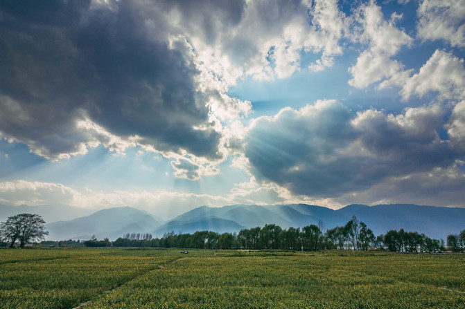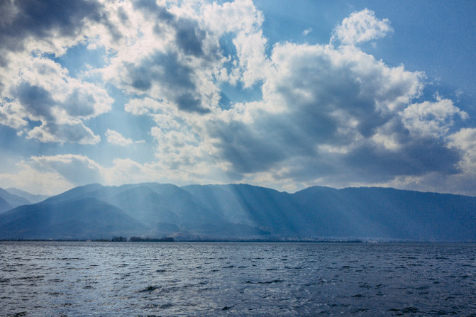 大理的云,是醉人的。正是因为云,洱海才不显得那么单调寂寞。你看,镶在天边的云,不停地变幻着形状,随风而走,时而点缀着蔚蓝的天空,时而掩着炽烈的日光。只见阳光穿过云,透下迷人的耶稣光,照得远处连绵的山和茂盛的田,时隐时现。这应该是苍山洱海最美的时刻了。