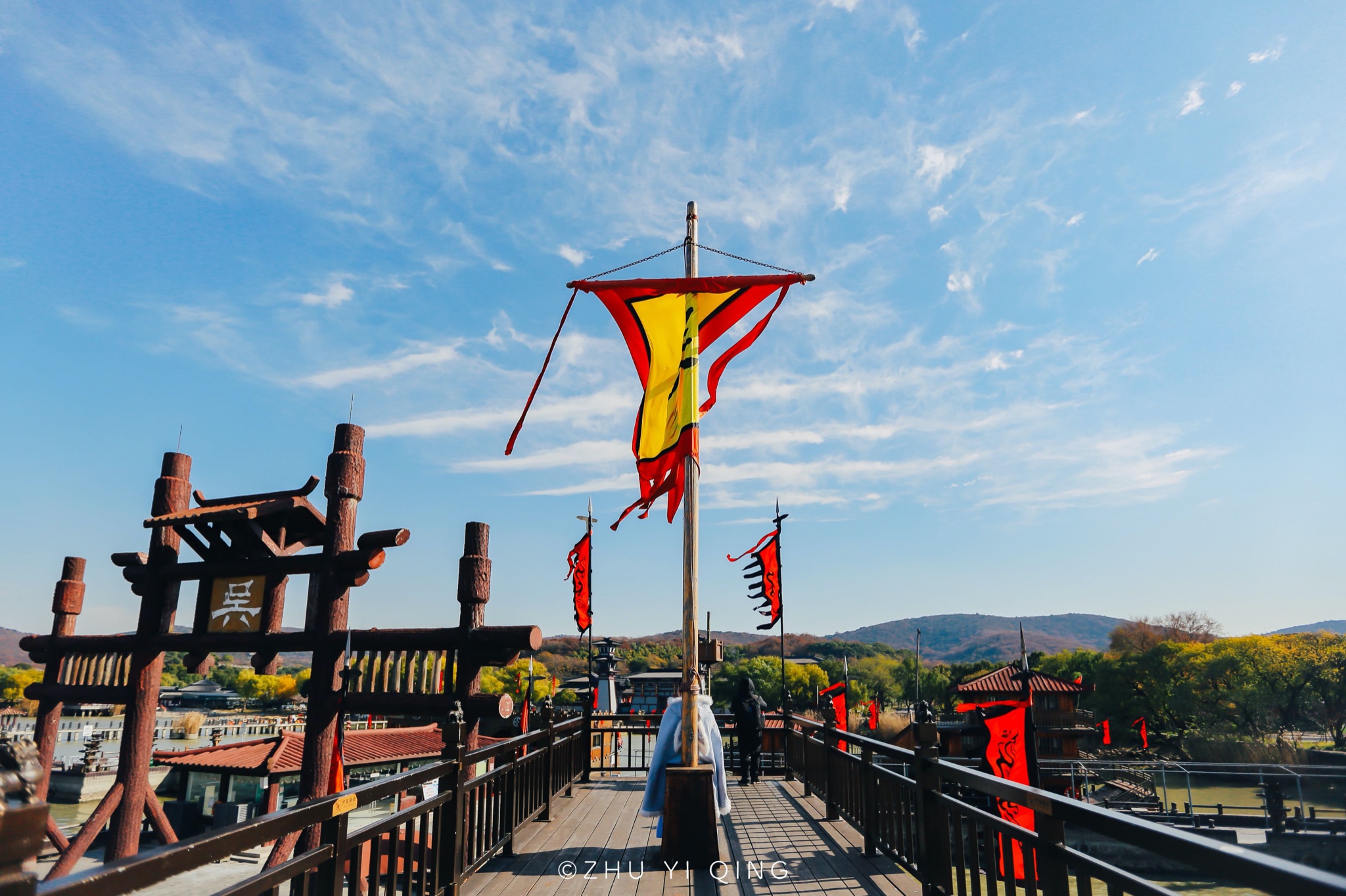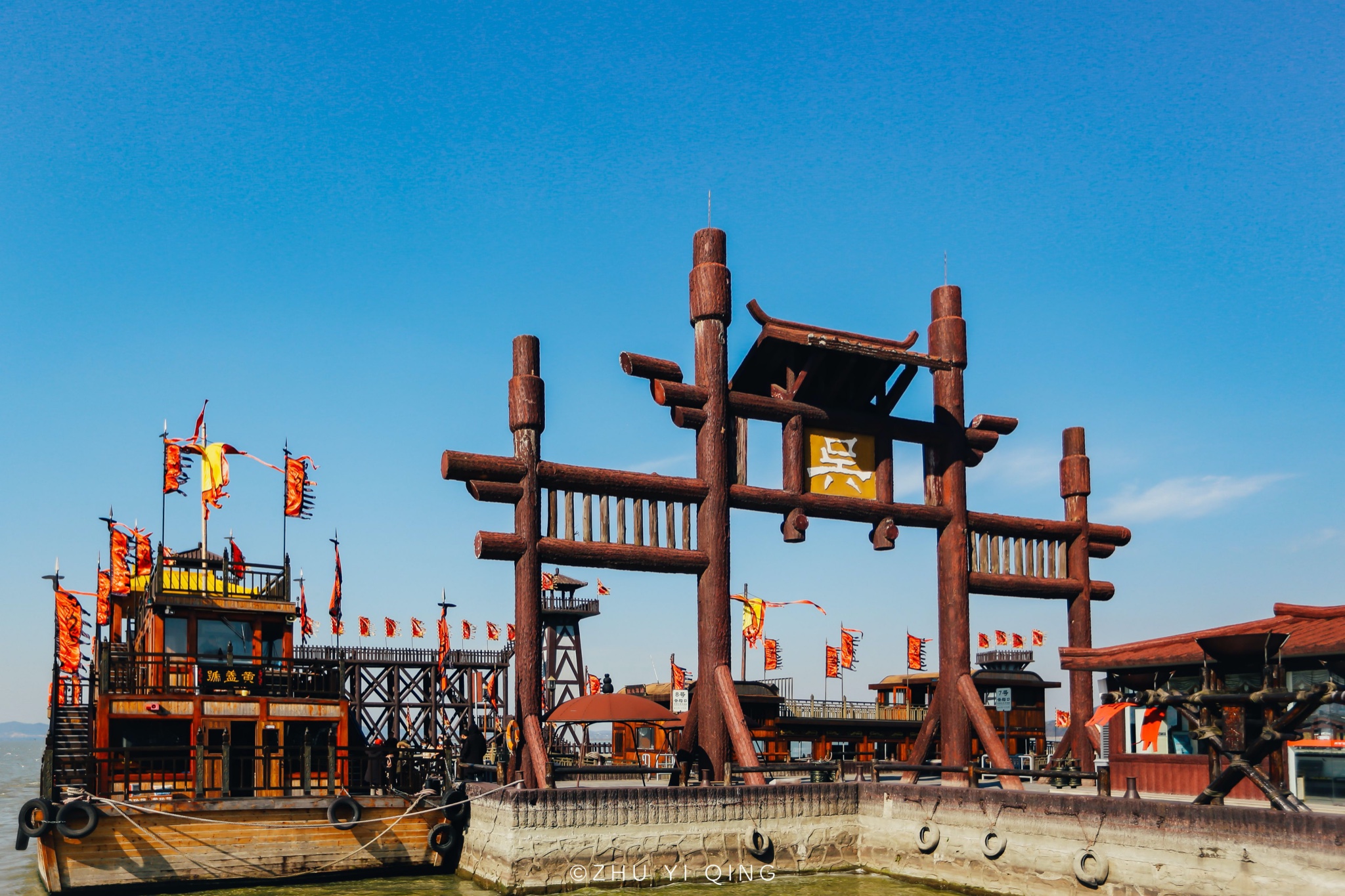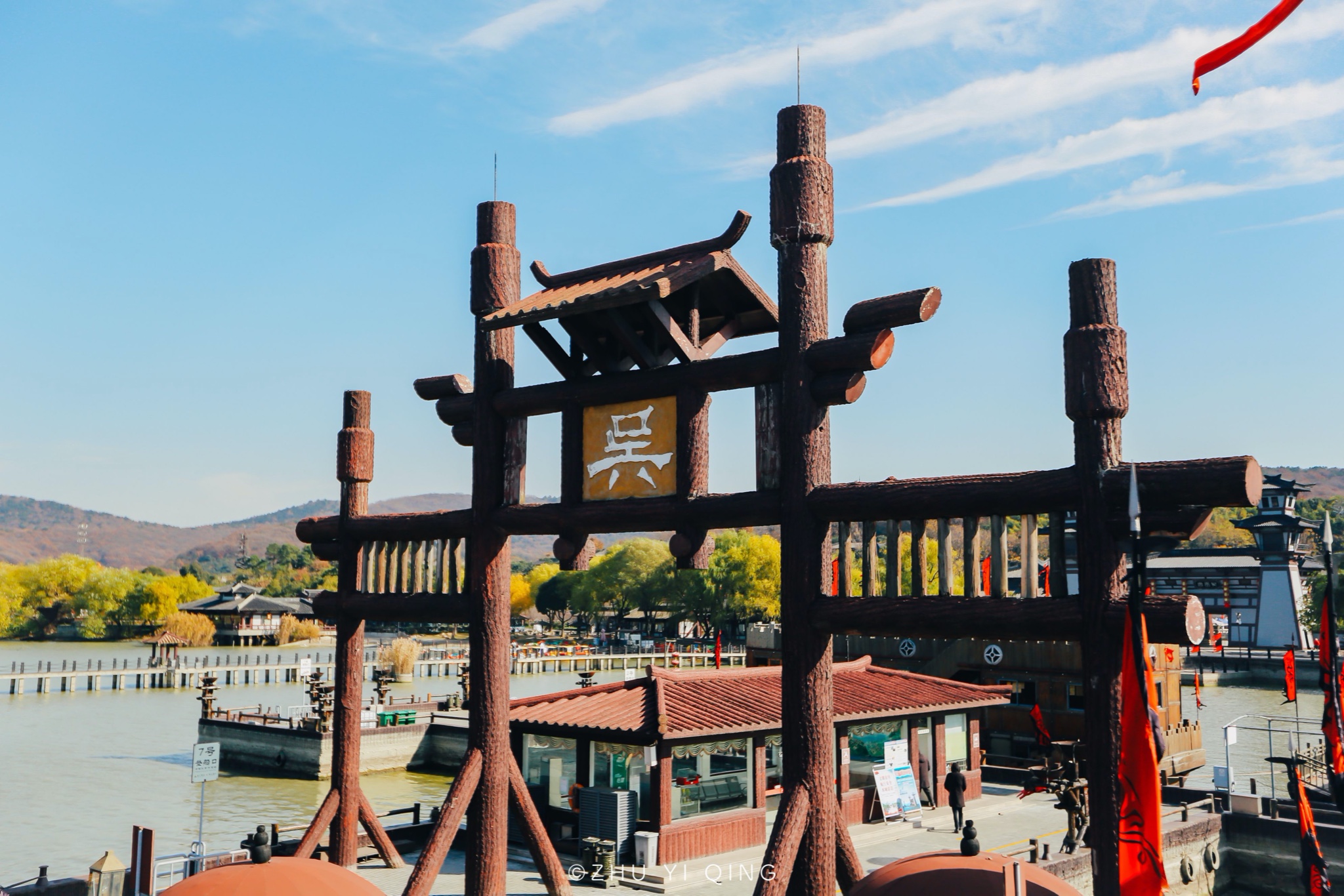 东吴水师的码头,一个大大的“吴”字,代表了它的身份,最大的那艘杏黄船,一看就是皇家的船,过去只有皇帝才能坐那样的船。如今作为游览船,买票就可以乘坐,畅游太湖风光,而如果你想欣赏冬日来这里栖息的红嘴鸥,也是从这个码头上船。