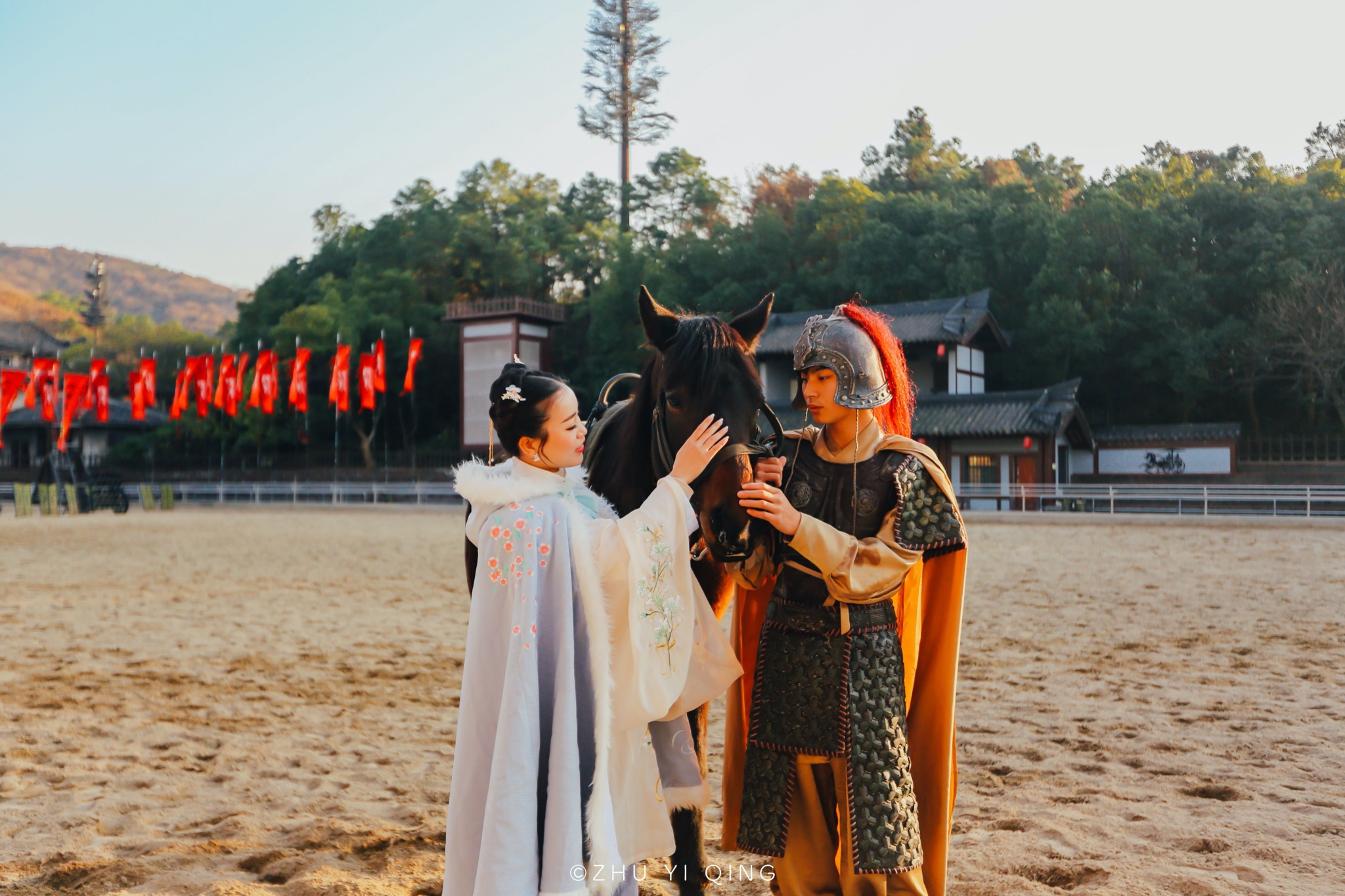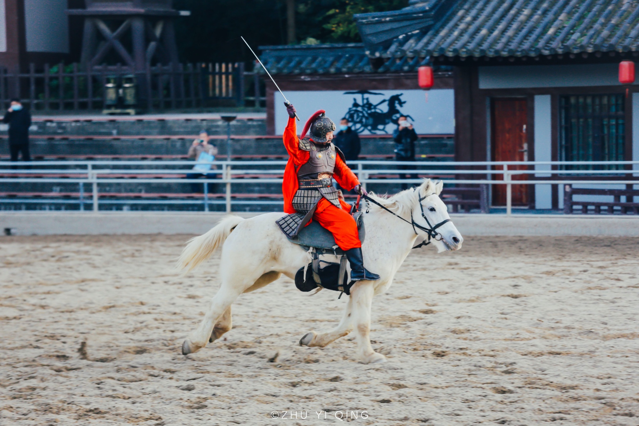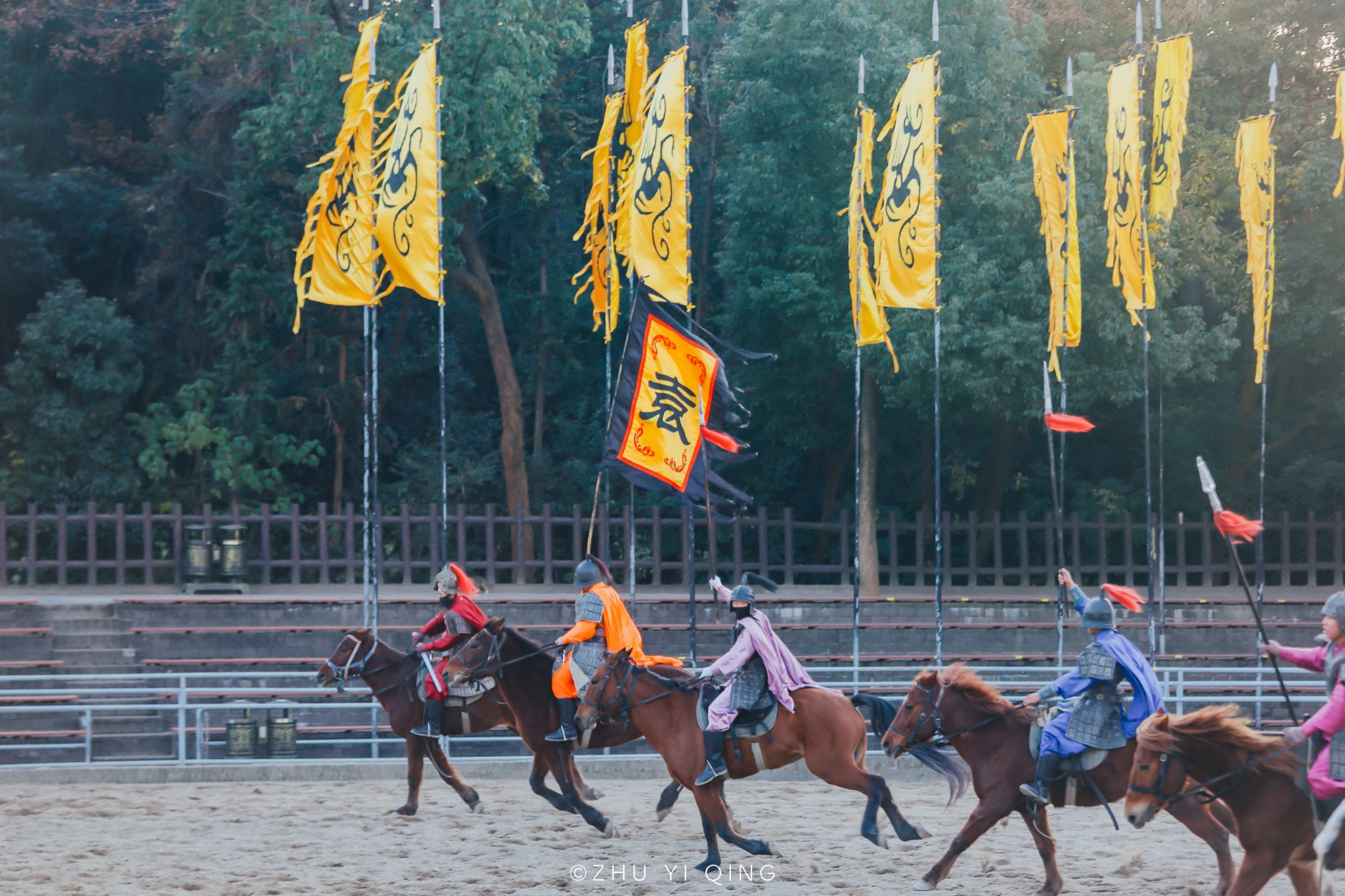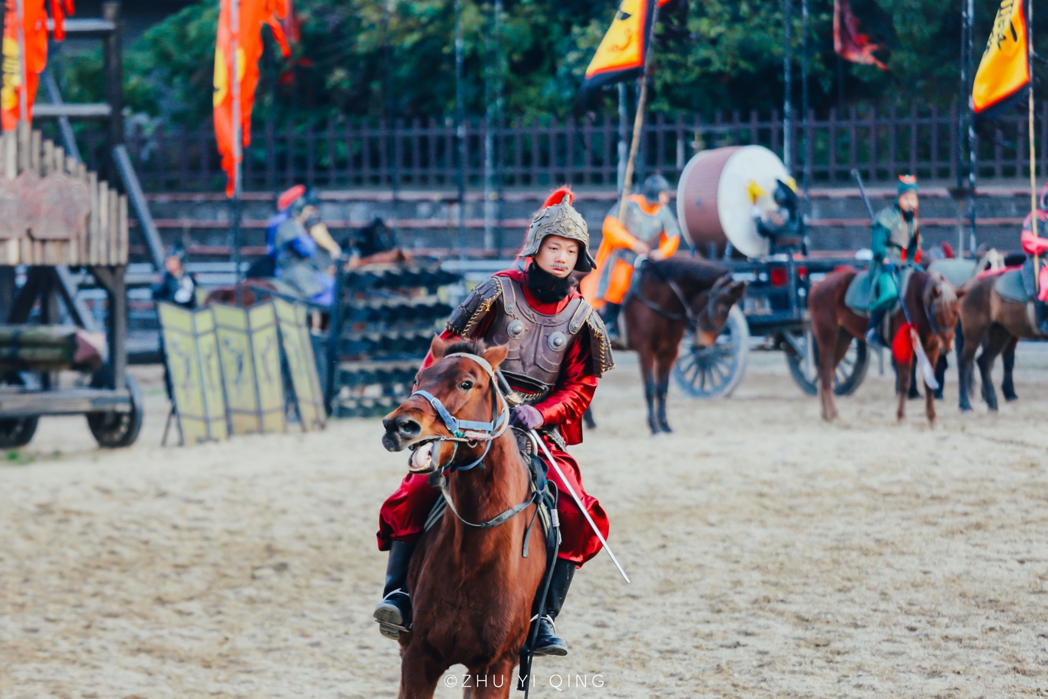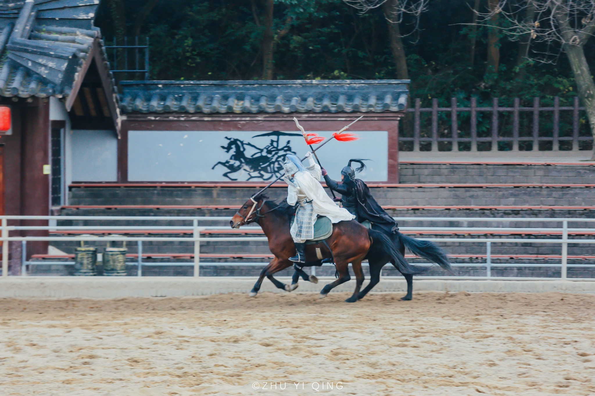 刘关张、袁绍的旗子竖立在那,一边看他们策马扬鞭,一边联想到火烧赤壁、官渡之战等三国各种历史战役,只听一阵喊声,把我思绪又拉了回来,只见吕布身穿白袍,策马而来,太帅了简直。而黑胡子张飞,红脸关公,大哥刘备追赶着吕布,一场大战即将上演。