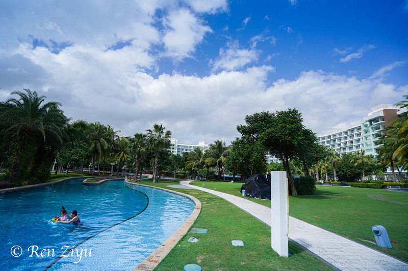 威斯汀的户外泳池像是一条自然形成的河道,蜿蜒曲折,椰林随着河道的两侧自然生长,午后,透过密密麻麻的椰林缝隙,阳光把温暖洒在椰林里,形成了深深浅浅的椰影,泳池里的人们在正在划着小船,自由且惬意。