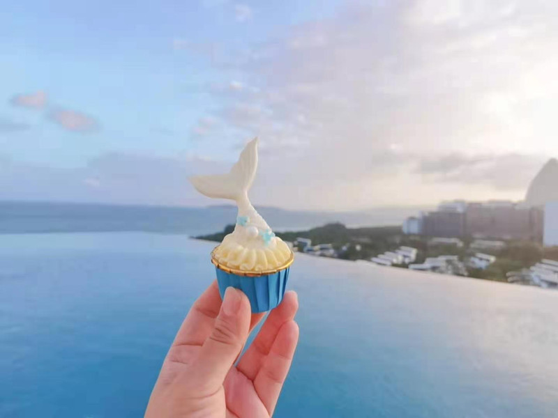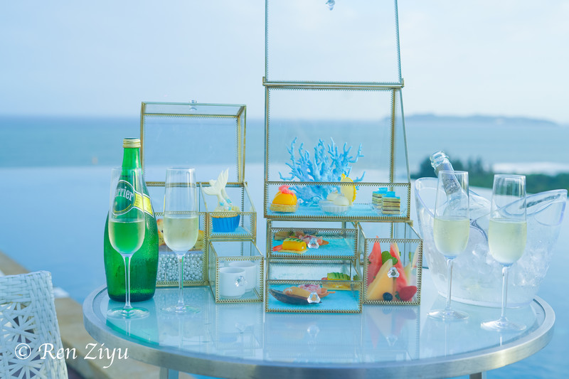 顶楼无边泳池也是酒店特色之一,下午茶以海色海洋为主题,用透明的盒子呈现,每一款甜点都是海洋的元素,看起来更像是海底世界的宝盒。