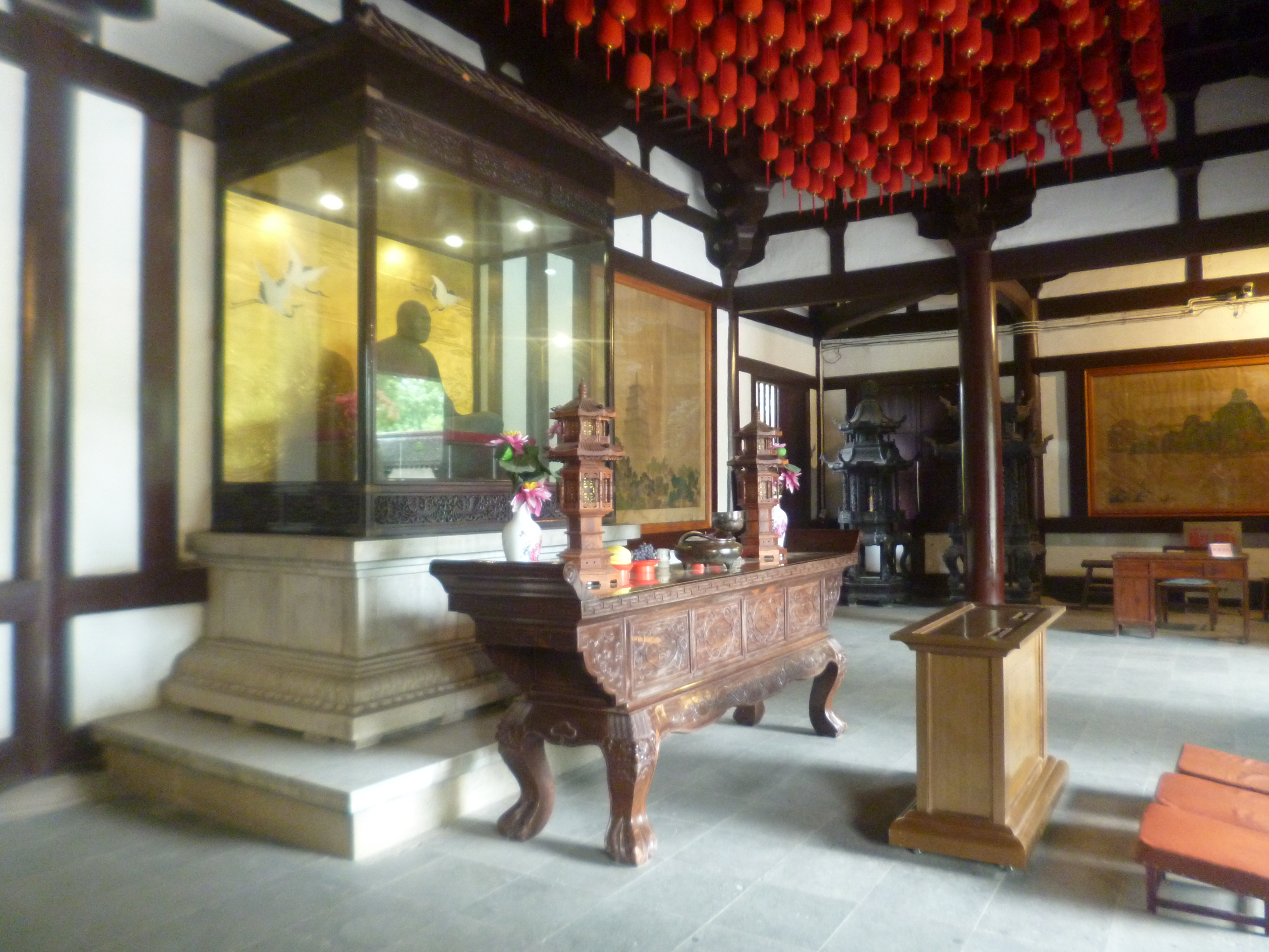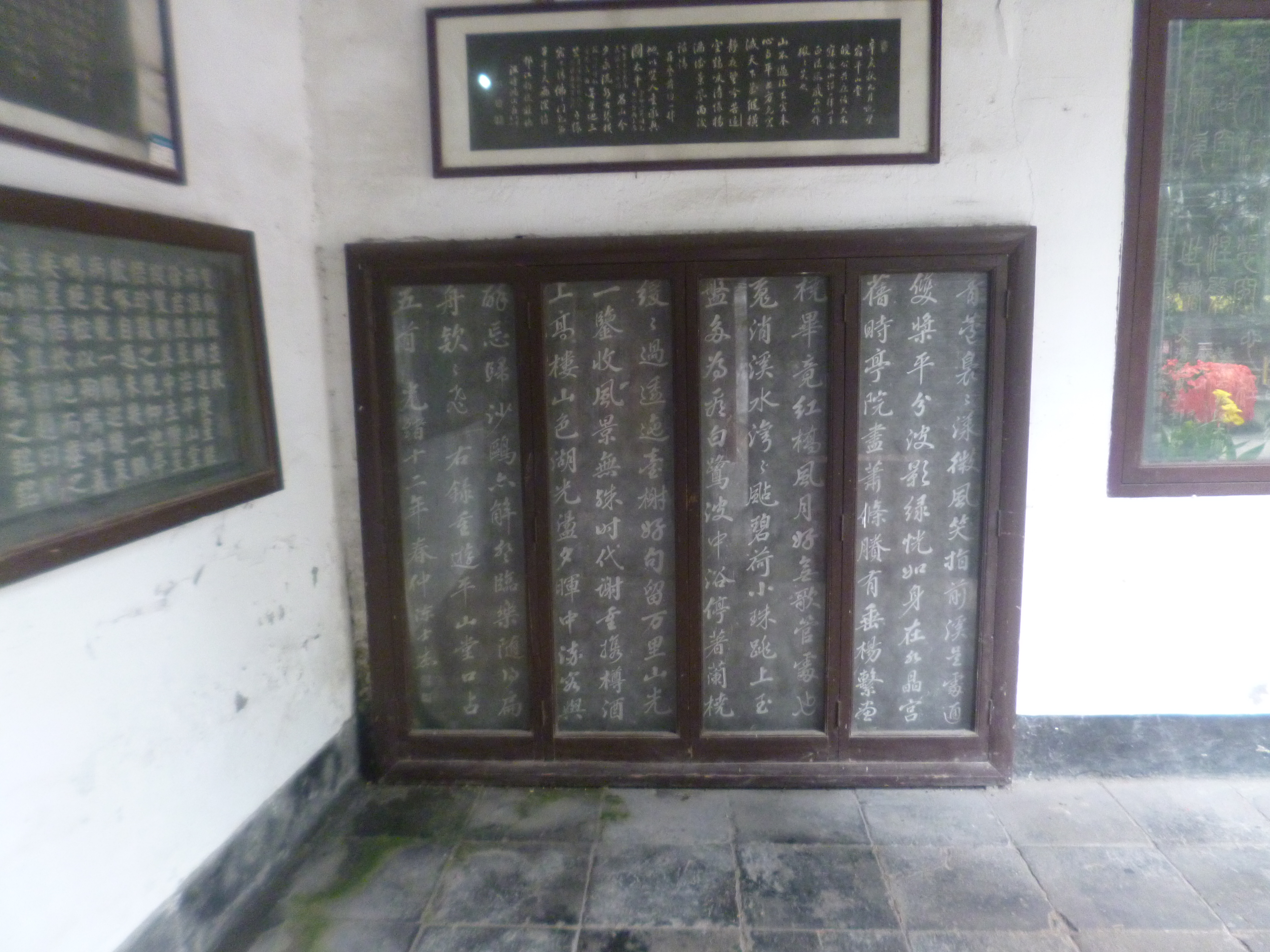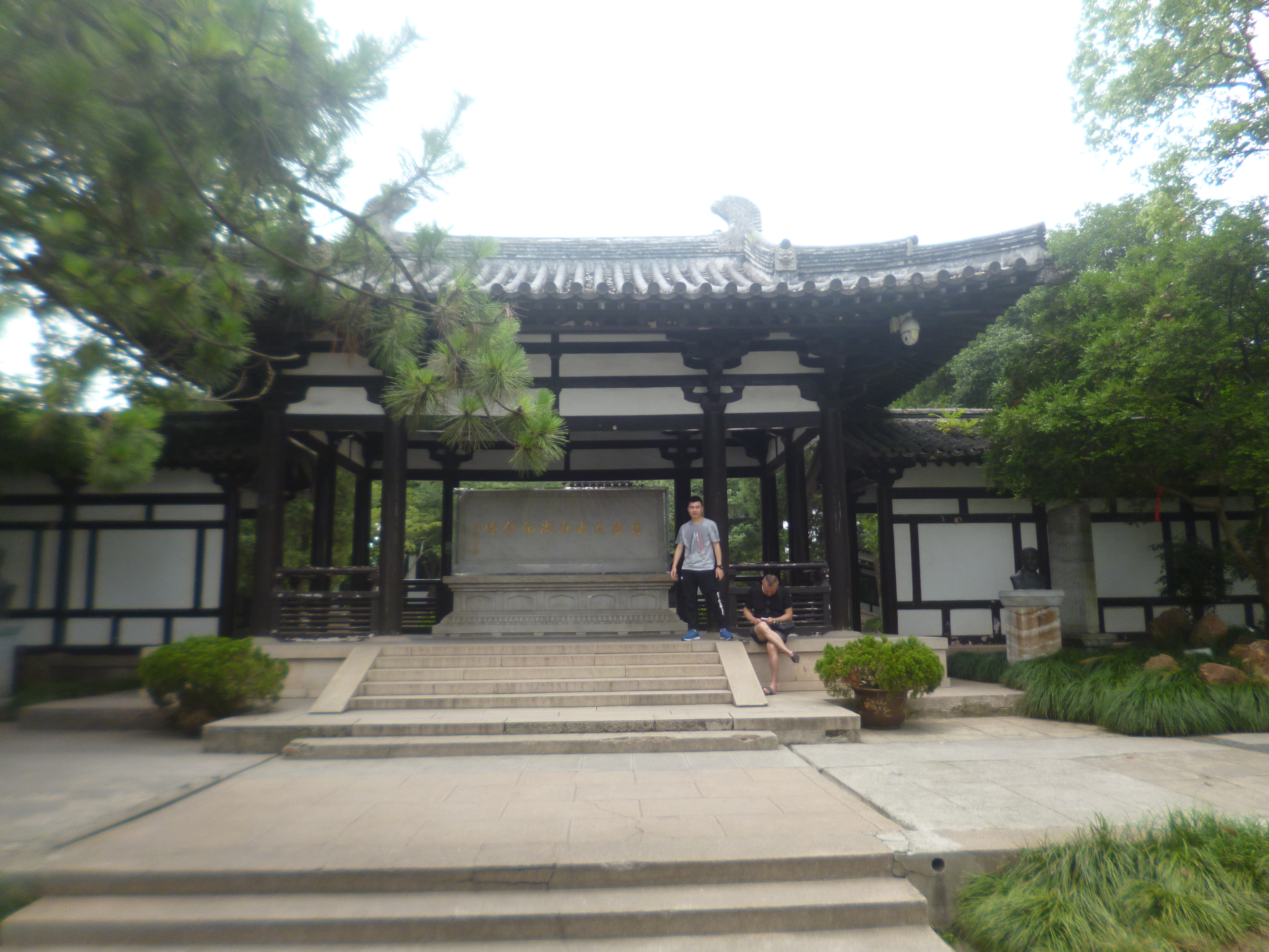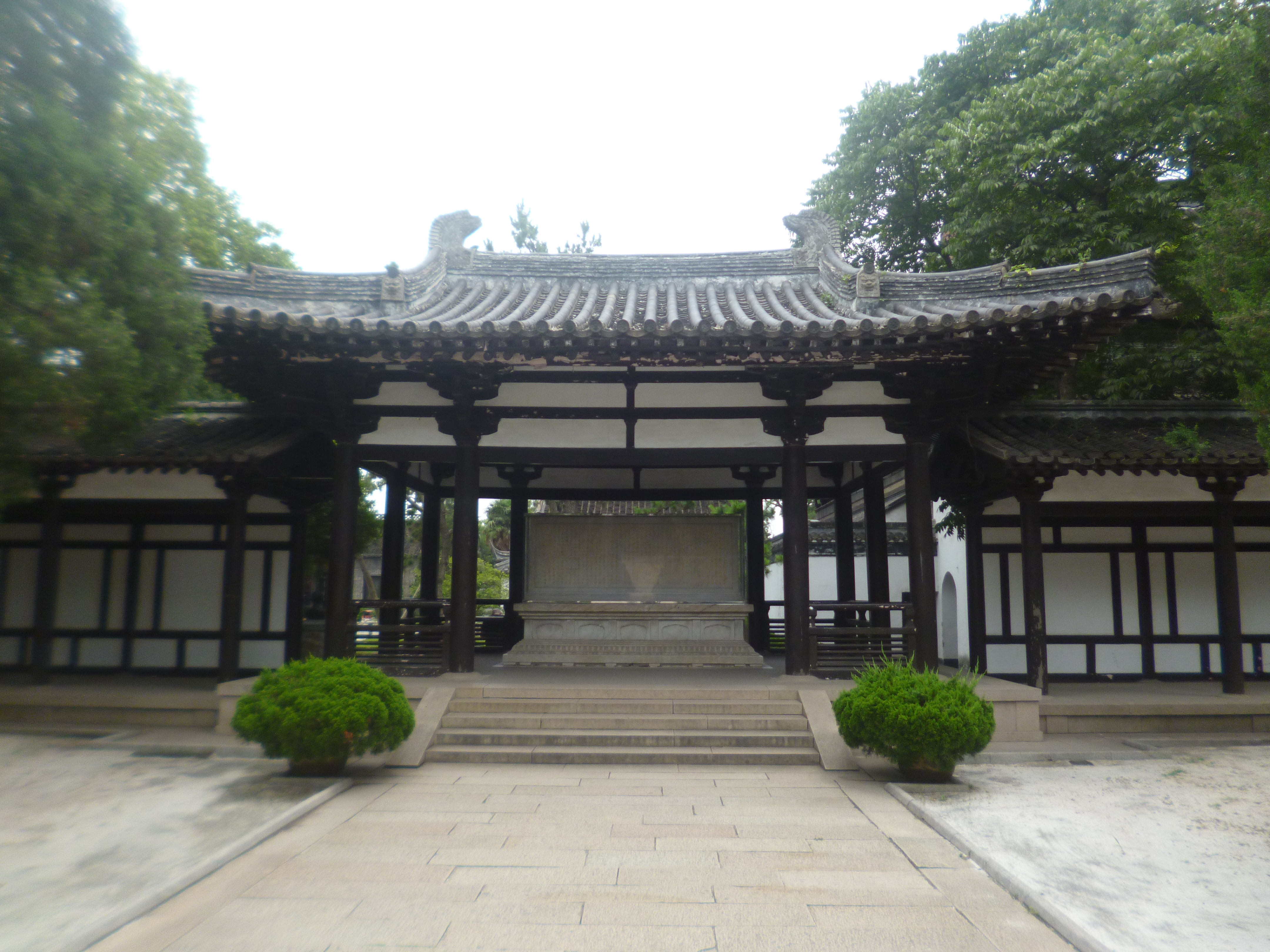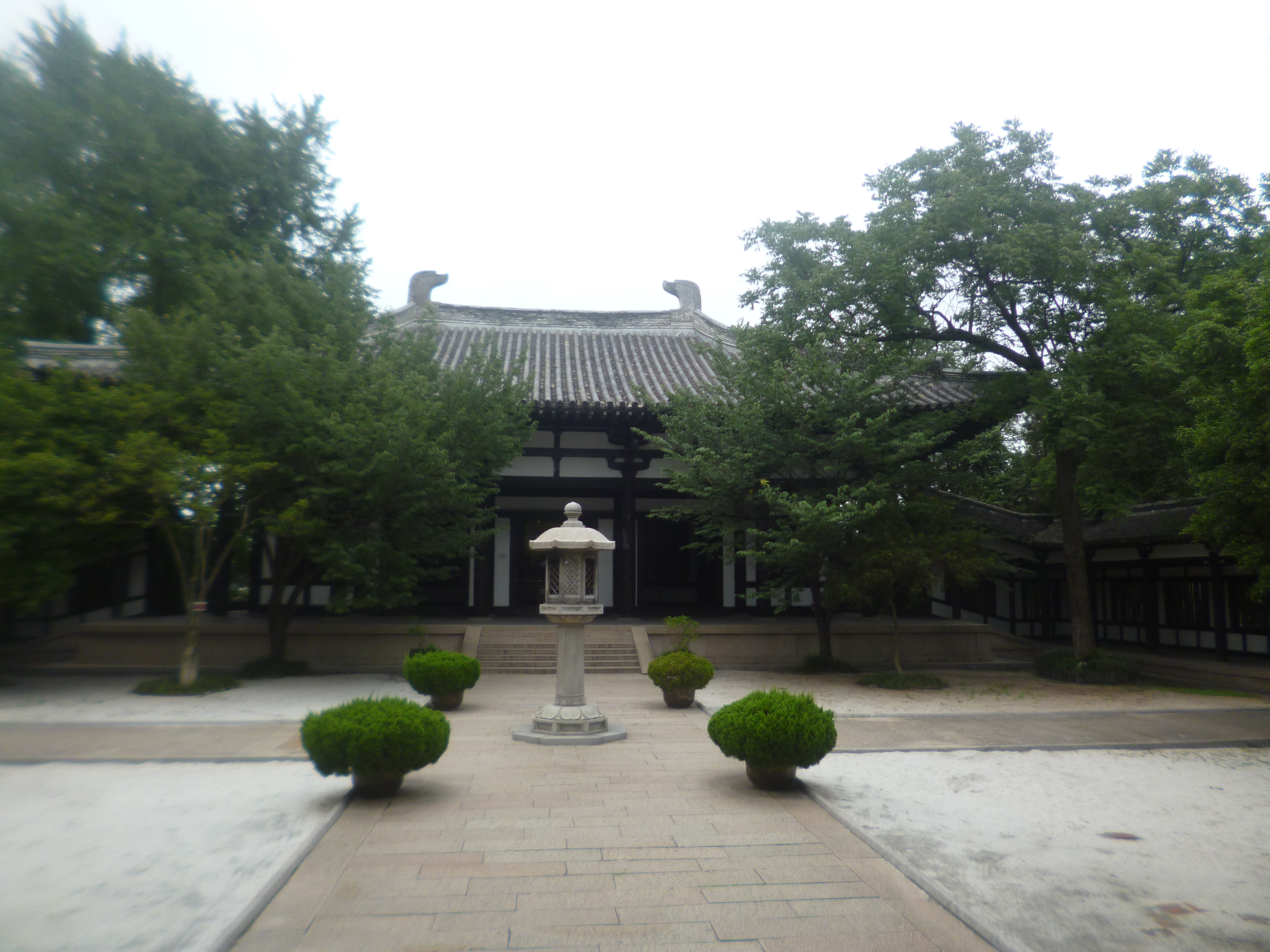 七、 鉴真 纪 念堂 鉴真纪念堂位于扬州市古大明寺内,1973年建成,以纪念对中日两国文化交流作出重大贡献的鉴真和尚。由我国著名建筑学家梁思成参照鉴真在日本的主要遗物唐招提寺金堂设计建筑,典雅古朴,保存了唐代的建筑艺术风格。前面是门厅,上悬匾额;中间为碑厅,内立横式纪念碑;后为殿堂,按唐代寺庙殿堂的风格建造,堂内正中为鉴真楠木雕像,仿鉴真圆寂前塑造的干漆夹纻像制作而成,神态安详而坚毅。东西两侧壁上是鉴真东渡事迹的饰布画,分别是西安大雁塔、肇庆七星岩、日本九洲秋妻屋浦和奈良唐招提寺金堂,向人们展示了鉴真生活和经历过的地方。 (一)、 碑 厅