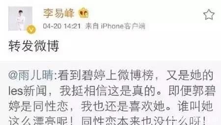 以及李易峰的激情转发,就似乎“坐实”了郭碧婷同性恋传闻。
